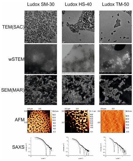 Typical experimental measurements of monodisperse silicate solutions (Ludox). According to the manufacturer’s documentation, the estimated size of SM-30 is 7 nm, HS-40 is 12 nm, and TM-50 is 22 nm. Experimental data include Transmission Electron Microscopy (TEM), wet Scanning Transmission Electron Microscopy (wSTEM), Scanning Electron Microscopy (SEM), Atomic Force Microscopy (AFM), and Small-Angle X-ray Scattering (SAXS). Scale bars are given on the EM images or on the x-axis and y-axis of AFM images. Height color scales are shown on the right of AFM images.