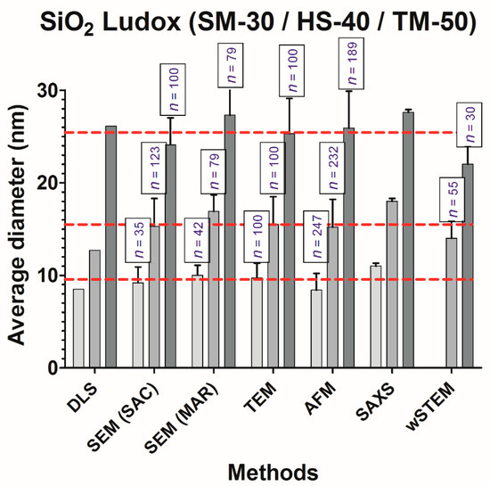 Size measurement of three monodisperse solution of SiO2 nanoparticles (Ludox). Measurements were performed with Dynamic Light Scattering (DLS), Scanning Electron Microscopy (SEM), Transmission Electron Microscopy (TEM), Atomic Force Microscopy (AFM), Small-Angle X-ray Scattering, and liquid Scanning Transmission Electron Microscopy (wet-STEM). Results on Ludox SM30/HS40/TM50 are shown in light/medium/dark gray colors, respectively. The red dashed lines correspond to the average values of all the applied methods: 9.3 ± 1.5 nm for SM30, 15.6 ± 2.6 nm for HS40, and 25.4 ± 2.9 nm for TM50. n represents the number of measurements obtained in each method.