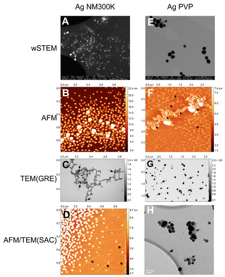 Samples of recorded microscopy images on silver NPs: (A–D) for Ag NM-300K; and (E–H) for Ag PVP. Whereas the global average of NM-300K size is 17.1 ± 3.5 nm, there is a presence of significantly larger NPs (indicated with black or white arrows) around 50 nm as observed in: wSTEM (dark field) (A); AFM (B); and TEM (C). Illustration of silver NPs stability as observed with AFM (D), where weakly bound NM-300K NPs were pushed around by the AFM tip (silver traces are indicated with black arrows) which results in a noticeable reduction in NPs height. Conversely, whereas the global average of PVP size is 55.8 ± 3.7 nm, there is a presence of smaller NPs (marked with black arrows) in wSTEM (E) and TEM (G) images. In AFM (F) and TEM(SAC) (H), the coating layer of PVP surrounding silver NPs is clearly seen (marked with black arrows), which is one explanation of the smallest average NPs size determined by AFM. Note that the color scale has been adjusted for the AFM data (F) so that the small height of PVP remains visible while NPs appear in bright white colors.