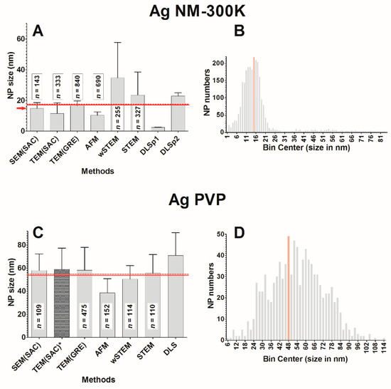 Average size measurements for Silver NPs: (A) Ag NM-300K; and (C) Ag PVP; and their respective frequency distance histogram distributions: (B) Ag NM-300K; and (D) Ag PVP. Methods are Dynamic Light Scattering (DLS), Scanning Electron Microscopy (SEM), Transmission Electron Microscopy (TEM), Atomic Force Microscopy (AFM), wet Scanning Transmission Electron Microscopy (wSTEM), and Scanning Transmission Electron Microscopy (STEM). The difference in the sample between wSTEM and STEM is the presence of liquid in the former, whereas it is dried in the latter. When two distinct populations of NPs are observed, they are reported with p1 and p2 keywords. The red lines in (A,C) indicate the global average NP size values determined by direct techniques only, 17.0 nm for NM-300K, and 53.9 nm for Ag PVP, whereas the dashed lines indicate the global NP size values determined by both direct and indirect techniques, 17.1 nm for NM-300K, and 55.8 nm for Ag PVP. The red arrow in (A) indicates the size of the NM-300K narrow population determined in the JRC report. The principal mode values are highlighted in pink on the frequency distance histograms: 15 nm for Ag NM-300K and 48 nm for Ag PVP. The * indicates that the value has been published earlier [47].