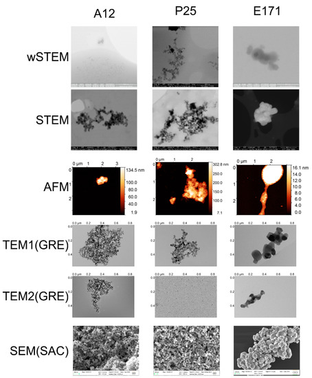 Three TiO2 NPs were selected for their interest in nanotoxicology. Suspensions of TiO2 (P25) were obtained after strong sonication of commercial products; primary particle size of P25 is given around 21 nm from the manufacturer and a recent analysis reports a value of 23 ± 10 nm [49]. Due to the high temperature synthesis of P25 NPs, they are constituted of two kinds of particles: 75% of anatase, and 25% of rutile. An initial report using TEM indicates that the average size of anatase is 85 nm, whereas that of rutile is 25 nm [66]. TiO2 A12 was determined around 12 nm in size [67]. Food additive E171 was directly purchased from a manufacturer as a white powder; size of E171 is unknown but usually advertised as above 100 nm in diameter; it is therefore not considered as a nanomaterial in consumer products. A major difference with previously presented NPs is the strong tendency of all TiO2 NPs to agglomerate, in both liquid and dry conditions (Figure 7), especially for P25 and A12 NPs, which are synthesized by gas phase methods (flame spray or laser pyrolysis) usually producing agglomerated materials.