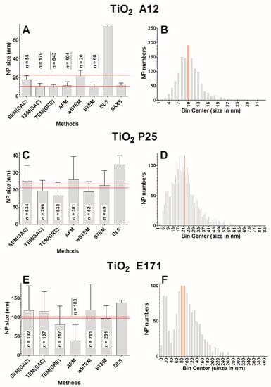 Average size measurements for TiO2 NPs: (A) A12; (C) P25; and (E) E171; and their respective frequency distance histogram distributions: (B) A12; (D) P25; and (F) E171. Methods are the same as in Figure 6 plus Small-Angle Xray-Scattering (SAXS). The red lines in (A,C,E) indicate the global average NP size values determined by direct techniques only, 10.5 nm for A12, 21.3 nm for P25, and 94.8 nm for E171, whereas the dashed lines indicate the global NP size values determined by both direct and indirect techniques, 22.5 nm for A12, 23.5 nm for P25, and 101.3 nm for E171. The principal mode values are highlighted in pink on the frequency distance histograms: 10 nm for A12, 22 nm for P25, and 85 for E171.