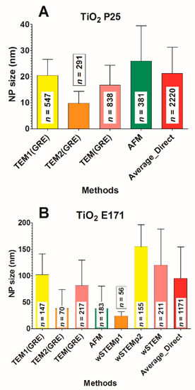 Average size measurements for sub-populations of TiO2 NPs: (A) P25; and (B) E171. The larger size populations are colored in yellow, whereas smaller size populations are in orange. Global average of NP sizes within the same technique is colored in pink. The large SD values in AFM data (green columns) prompted checking for the presence of smaller NPs in TEM data by changing the protocol of NPs deposition (TEM1, carbon floatation; and TEM2, direct deposition; see Materials and Methods). For both NPs, the TEM2 method identified the presence of smaller NPs than with the TEM1 method, in close agreement with AFM results (which is using a direct deposition method). The global average value of all tested direct techniques is shown in the last column (in red). The two sub-populations observed in wet-STEM were described prior to the change of TEM(GRE) protocol.