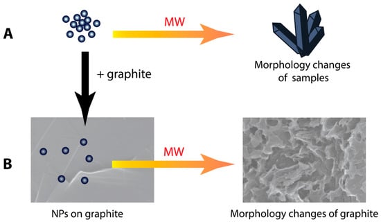 Possible effect of MW-treatment on metal-containing substances (A); and MW-treatment effect on graphite support in presence of metal-containing substances (B).