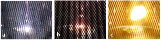 To study structural changes in the initial powders under microwaving, the treatment was carried out for five minutes at power of 900 W. By their behavior under the microwave irradiation conditions, the samples could be conventionally divided into four types: (type 1) the absence of any manifestations during microwave processing or low heat; (type 2) weak MW-absorption or reflection of microwaves: a single spark discharge; (type 3) middle MW-absorption: red heat and red sparks; (type 4) intensive MW-absorption: spark discharges, glow of plasma, flame appearance with red heat (Figure 2).