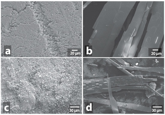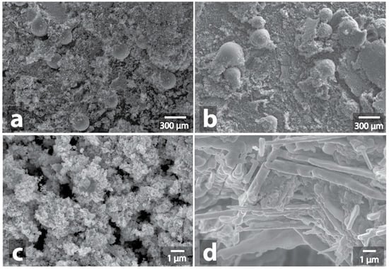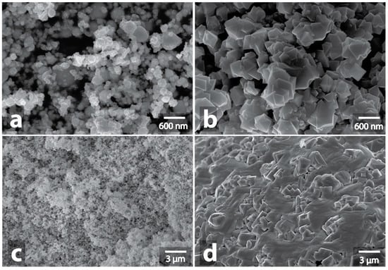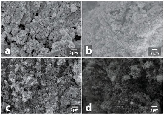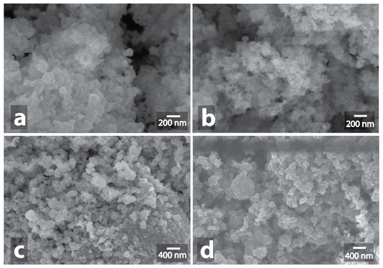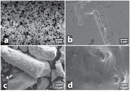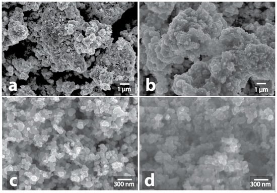 A similar result was observed in the case of tungsten carbon composition (W-C). Despite the fact that the color was changed from black to yellow during the treatment, as tungsten oxide was formed, no changes in the sample morphology were revealed by SEM examination (Figure 9a,b, Figures S75–S80, Figure S211). At the same time, XRD confirmed the formation of tungsten oxide WO3 as the main phase (Figures S221, S222). In the case of vanadium carbon composition (V-C), the color remained black, but a reduction in volume of the powder due to its compaction was substantial. At the same time, no changes in the V-C sample morphology were observed in SEM images (Figure 9c,d, Figures S81–S84, Figure S212).