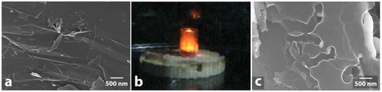 All samples that underwent microwave treatment were subsequently examined by SEM. Microwave irradiation effects on mixtures of graphite powder with metals or metal compounds are presented in Table S3. The etching of the graphite particles surface, the formation of trenches and pits on graphite sheets were observed for almost all of the samples (Figure 11 and Figures S105–S166). The mixtures of graphite with Fe/C (Figures S113, S114), Mo/C (Figures S125, S126), V-C (Figures S158, S159), W-C (Figures S156, S157), MoS2 (Figures S151–S153) where traces of etching were present either in small amounts or absent, were an interesting exception. Another interesting finding was that the intensive surface etching of the graphite particles was also observed for Cu (Figures S117–S120), Cu/C (Figures S121, S122), Ni (Figures S115, S116), Co (Figures S111, S112), W-Cu (Figures S131, S132), Cu-W (Figures S129, S130), W-Ni-Fe (Figures S123, S124), TiN (Figures S140, S141) and even for some oxides such as WO3 (Figures S173–S176), ZnO (Figures S177–S180), TiO2 (Figures S183, S184), CuO (Figures S191, S192), Fe2O3 (Figures S187, S188), Y2O3 (Figures S193, S194), despite that their microwaving without graphite resulted in neither observable heating, nor the intrinsic morphology modification. Only the aluminum, silicon and nitrogen compounds, such as AlN (Figures S136, S137), AlON (Figures S138, S139), Al-B (Figures S154, S155), TiCN (Figures S142, S143), SiC (Figures S147–S150) as well as oxides Al2O3 (Figures S167–S170), SiO2 (Figures S171, S172), ZrO2 (Figures S181, S182), CoO (Figures S185, S186), SnO2 (Figures S189, S190), MgO (Figures S195, S196), Cr2O3 (Figures S197, S198), ZrO2-SiO2 (Figures S199, S200) were inert. No external signs of the reaction, except the red heating of graphite, were observed during their treatment.