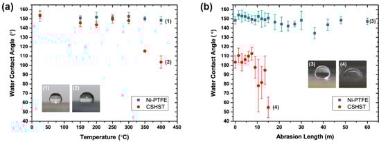 (a) WCA (Water Contact Angle) of Ni-70 vol% PTFE and CSHST after 60 min of heating at various temperatures. Error bars show the standard deviation of the measurements. Insets 1 and 2 show macro photographs of water droplets on Ni-PTFE and CSHST respectively after the 400 °C heat treatment. (b) WCA of Ni-PTFE and CSHST after 60 min of heating at 400 °C and subjected to abrasive wear on 800 grit silicon carbide paper. Insets 3 and 4 show macro photographs of water droplets on Ni-PTFE and CSHST after heating to 400 °C and after abrasive wear on 800 grit silicon carbide paper over abrasion lengths of 60 m and 15 m, respectively.