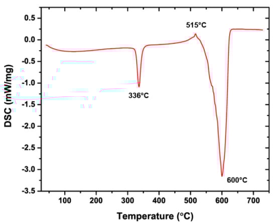 DSC curve of PTFE powder. The melting point of PTFE is 336 °C and decomposition initiates at 515 °C.