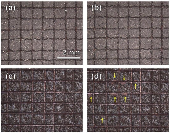 Cross-cut tape test of superhydrophobic coatings after heating to 400 °C for 60 min. (a,b) Ni-70 vol% PTFE before and after the tape test. None of the squares of the lattice were detached. (c,d) CSHST coatings before and after the tape test. The arrows indicate regions of coating delamination.