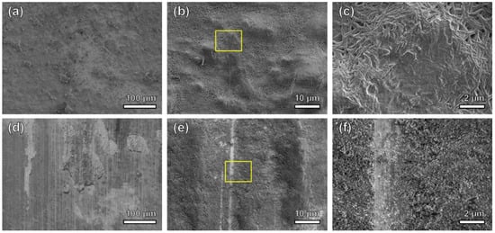 To investigate the wear resistance of the coating after high temperature exposure, a wear test was performed using the same parameters that were used to test the same materials in our previous study for the as-deposited state []. Using a simple abrasion wear test apparatus, 2000 Pa of downward force was applied to both the Ni-PTFE and CSHST samples after heating to 400 °C o ver an abrasion length of up to 60 m using 800 grit silicon carbide paper. The same Ni-PTFE and CSHST samples were used as the ones labeled as points 1 and 2 in Figure 3a. A summary of the results can be seen in Figure 3b. The Ni-PTFE sample was able to retain WCAs close to 150° for up to at least 60 m without major loss of the highly non-wetting properties. Secondary electron images after the abrasion test are shown in Figure 7a–c; some micro scale roughness can still be observed on the low magnification image (Figure 7a). At higher magnifications (Figure 7b,c), it can be seen that the PTFE strands superimposed on the microscale protrusions were destroyed by abrasion, while the lower lying submicron PTFE strands remained intact, still allowing remarkable non-wetting properties even after annealing and abrasion. In contrast, CSHST coatings annealed at 400 °C are only slightly hydrophobic (104°, Figure 3a) and became hydrophilic after relatively short abrasion exposure, mainly due to the pre-existing microcracks formed at a lower heating temperature (Figure 5d) that accelerated the delamination of the coating from the substrate during abrasion and the exposed hydrophilic Cu substrate can be clearly observed (Figure 7d–f).