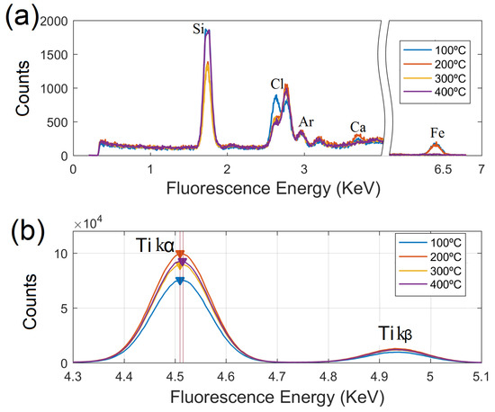 The samples were analyzed with the TRXF system just after their sol-gel preparation. The fluorescence spectra were split in two regions as shown in Figure 3. In the first panel, Figure 3a, the energy range from 4.3 to 5.1 KeV has been removed from the plots, displaying the peaks that emerge with low intensity. Due to the silicon nature of the carrier used in the experiments, strong Si peaks were presented in the spectra. Low contents (close to the limit of detection) of Cl, Ar, Ca and Fe were observed in the samples. The present of Ar was clearly expected due to the absorption effects of light Z elements when TRXF measurements are performed in air conditions [32]. Cl can be identified as trace constituent in the samples, as its strongest principal peaks (K and K) were found in the spectra with decreasing net intensity when annealing temperature increases. The presence of Cl in the samples is most probably due to the acidic aqueous conditions under which nano-TiO2 sols were prepared. The sol-gel preparation method ends up with some Cl ions remaining on the surface of the samples; such impurities, however, are easy removed after the thermal treatment is applied. Weak peaks of Ca and Fe were revealed in the spectra of the samples heat treated up to 200 °C. These impurities were probably arising from the background of TRXF test or the residual precursors. At higher temperatures, both Ca and Fe signals were markedly attenuated and therefore, did not reach significance in the samples annealed at 300 and 400 °C.