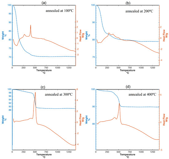 TGA and DSC curves of nano-TiO2 sols calcined at different temperatures: (a) annealed at 100 °C, (b) 200 °C, (c) 300 °C, (d) 400 °C. (a–c) Anatase phase transformation into rutile is affected by the annealing temperature and (d) by the initial particle size.