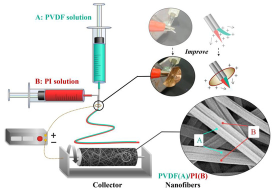 Composite materials, due to their versatility over traditional single-component materials, have attracted great attention [1,2,3,4]. Composite fibers, such as islands-in-sea, sheath-core, and side-by-side, can be prepared using melt-blown, spunbonded, and electrospinning techniques [5,6,7,8], which are widely used in many fields, such as filtration, catalysis, energy, electronics, bioengineering, and so on [9,10,11,12]. Electrospinning is one of the most effective methods to obtain continuous composite nanofibers, which can efficiently and conveniently fabricate composite nanofibers with different structures [13,14,15,16]. The side-by-side bicomponent composite fiber, with two different polymers orienting parallel in one fiber, can be made by side-by-side electrospinning [17,18]. Compared to coaxial electrospinning, the two polymer fibers from the side-by-side electrospinning can be directly in contact with the environment, making it easier to embody and maintain the unique performance advantages of each component. In addition, the synergistic effect can be obtained by the complementarity and the correlation of the two components, and finally a 1 + 1 > 2 effect on the overall performance of polyvinylidene fluoride/polyimide (PVDF/PI) can be achieved [19,20,21].