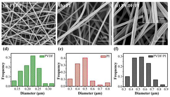 SEM images of PVDF (a), PI (b), and PVDF/PI (c) nanofibers; Fibers diameter distribution images of PVDF (d), PI (e) and PVDF/PI (f).