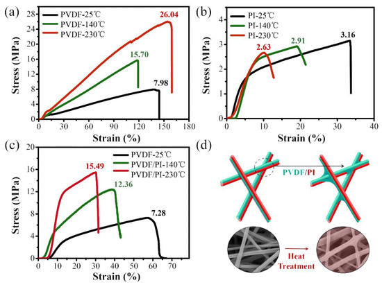 The stress–strain curves of PVDF (a), PI (b), and PVDF/PI (c) electrospun membranes before and after the heat treatment; Fibers heat treatment diagram (d).