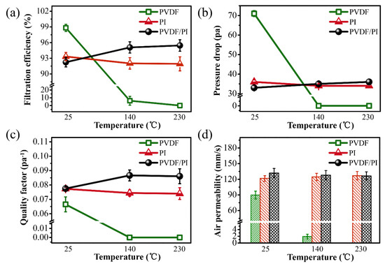 Filtration efficiency (a), pressure drop (b), quality factor (QF) (c), and air permeability (d) of PVDF, PI single-component fiber membrane and PVDF/PI bicomponent fiber membrane at 25 °C, 140 °C and 230 °C, respectively.