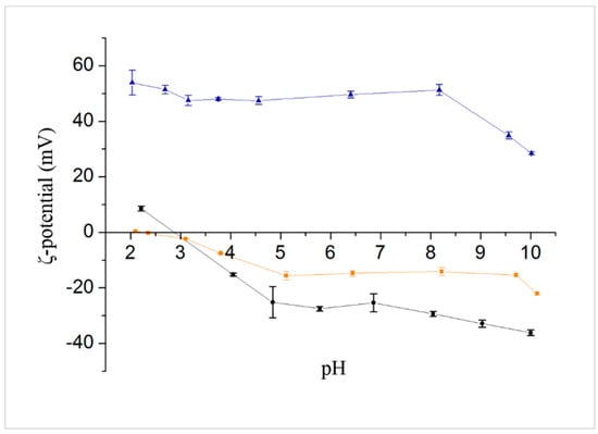 Trend of ζ-potential vs. pH for NRL–medium ammonia (MA) (●, - black line), SepS9 (■, - orange line) and SepB5 (▲, - blue line).