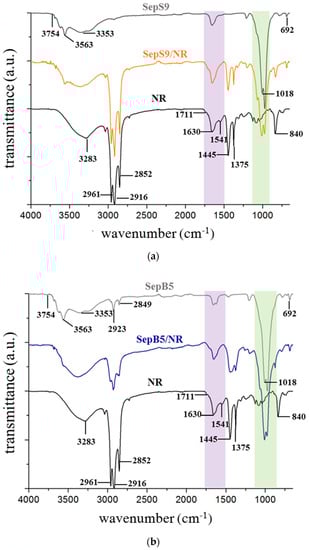 Fourier transform infrared spectroscopy (FTIR) spectra of (a) NR (black line), SepS9 (gray line), SepS9/NR biocomposite (orange line), (b) NR (black line), SepB5 (gray line), SepB5/NR biocomposite (blue line). The light green and violet shadow areas highlight the most significant spectral regions.