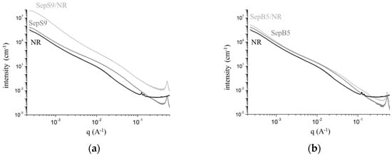 Scattering curves of (a) NR (black line), SepS9 (dark gray), SepS9/NR biocomposite (light gray), (b) NR (black line), SepB5 (dark gray), SepB5/NR biocomposite (light gray).