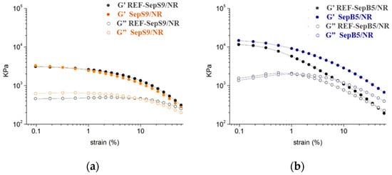 Strain sweep is a standard technique to quantify the contributions of the so-called “filler network” in composite materials formed by a percolating solid phase of filler particles embedded in a polymer matrix. Thus, in order to compare the behaviour of the filler network under large deformations or in the nonlinear region, strain sweep measurements at 80 °C were performed. The results of these measurements are shown in Figure 7 in terms of storage (G’) and loss moduli (G″), for both fillers SepS9 (Figure 7a) and SepB5 (Figure 7b).