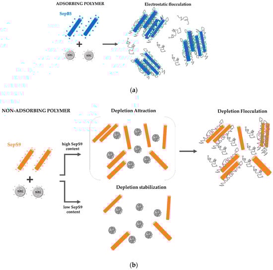 Proposed mechanisms for the flocculation process in (a) SepB5/NR and (b) SepS9/NR systems.