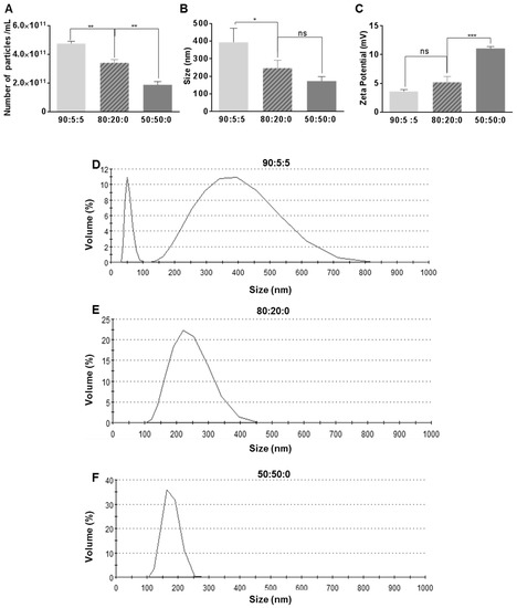 Figure 1 illustrates the impact of the composition ratio on the size, the number of particles, zeta potential, and size distribution for the three composition ratios of 90:5:5, 80:20:0, and 50:50:0. Figure 1A shows that the number of particles decreases as we decrease the base lipid DSPC and increase the PEG component of the ONBs. In the case of 90:5:5, the number of particles is 4.77 × 1011 particles/mL, while in case of 80:20:0 it is 3.4 × 1011 particles/mL, which is 27% less. For the sample with a 50:50:0 composition, the number of particles is 1.88 × 1011 /mL, which is approximately 60% less than for the 90:5:5 sample. Figure 1B illustrates the impact of the composition ratio on the size. The ratio 90:5:5 exhibits a mean size of 394 ± 79 nm, 80:20:0 has a mean size of 246 ± 46 nm, and 50:50:0 has a mean size of 173 ± 25 nm. This reduction in size can be attributed to the high surfactant ratio.