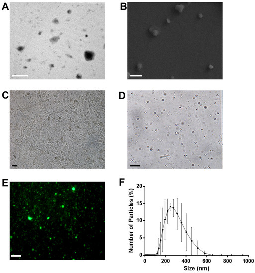Figure 2 illustrates the characterization of ONBs in the 85:8:7 composition ratio. Figure 2A shows a TEM image of ONBs. Figure 2B depicts an SEM image. These images contain both micro-sized and nano-sized particles. Figure 2C shows MDA-MB-231 cells injected with ONBs, captured through an optical microscope. Figure 2D shows an image of micro-sized particles on a glass slide in optical microscopy, while Figure 2E presents a fluorescent image of ONBs when FITC-avidin was conjugated with ONBs through an avidin-biotin interaction. Figure 2F depicts the size distribution of ONBs obtained through DLS. The mean size is approximately 300 nm, while the distribution range is mainly between 200 and 500 nm.