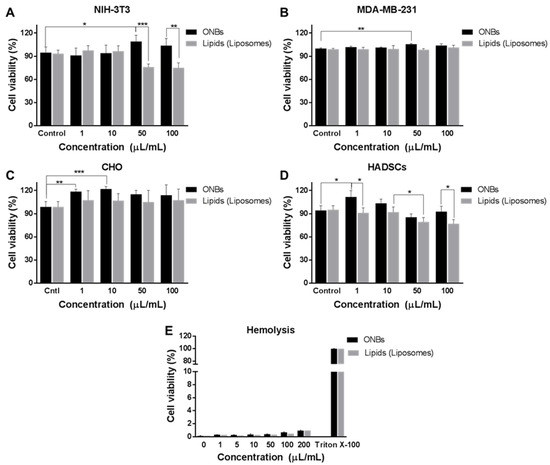 Figure 3 illustrates the cell viability against various concentrations of ONBs and lipid constituents in various cell lines. Figure 3A shows the cell viability of ONBs and lipids in NIH-3T3 cells. The control ONB group has a cell viability of 94%, while 1 μL/mL and 10 μL/mL exhibit similar cell viabilities. However, in the 50 μL/mL case, cell viability is enhanced by 15% compared with that in the control case, and for 100 μL/mL, cell viability is enhanced by 7%. Conversely, the lipid constituents reduced cell viability by approximately 20% when they were utilized in 50 μL/mL and 100 μL/mL concentrations. This result indicates that a higher concentration of lipids reduces cell viability in NIH-3T3. However, ONBs in concentrations of 50 μL/mL and 100 μL/mL improved the cell viability by more than 30% as compared to lipids of similar concentrations, which can be attributed to the presence of oxygen and higher availability of oxygen.