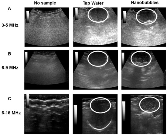 Ultrasound images of ONBs. No sample, tap water, and nanobubbles were compared. (A) shows images with a 3 to 5 MHz transducer. (B) shows images for a 6 to 9 MHz transducer. (C) shows images with a 6 to 15 MHz transducer.