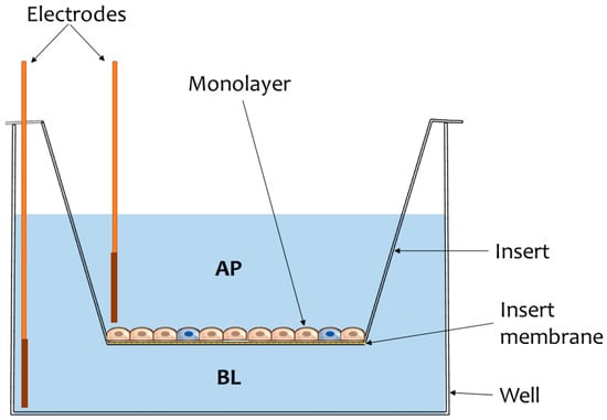 Illustration of a common experimental model used in intestinal transport studies. The cells are cultivated on inserts supplied with semipermeable membranes through which microparticulate diffusion may occur. Monolayer integrity is usually assessed by measuring transepithelial electrical resistance (TEER) using chopstick electrodes inserted in the apical (AP) and basolateral (BL) compartments of the well.