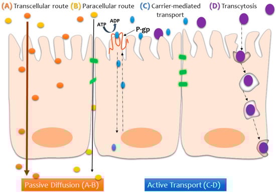 The physicochemical properties of the compounds that are tested in transport studies also have a huge impact on the rate of absorption and, in some cases, require functionalization in order to facilitate (or even allow) assimilation across the intestinal mucosa [3]. Depending on the nature of the compound, it may reach the other side of the epithelium by way of the transcellular or paracellular route (via passive diffusion), transcytosis, or active transport (via carrier-mediated transport), as depicted in Figure 2.