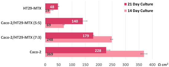 Drug permeability coefficients have been historically assessed using simple Caco-2 cultures. This classical intestinal model does present itself with many limitations, one of which is an abnormally high transepithelial electrical resistance (TEER). TEER measurements ensure the consistent monitoring of tissular integrity because it is a highly sensitive, non-invasive technique. TEER values also inversely correlate with paracellular permeability, making it the method of choice for intestinal transport studies [30]. In vivo studies reveal different TEER values between different regions of the human gut; post-confluent Caco-2 monocultures are known to generate signals that vary between 150 and 500 Ω cm2, whereas in vivo TEER recordings place the intestinal epithelium in a realistic range of 12–69 Ω cm2 [17,30]. This significant difference can be explained by the fact that Caco-2 cells in culture form many more tight junctions.