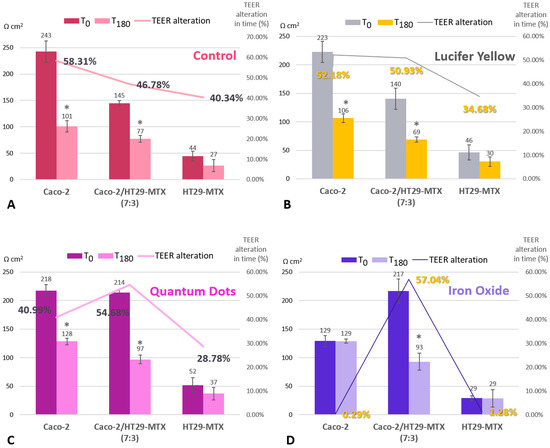 TEER alteration for control cells (A), cells incubated with Lucifer Yellow (B), with Si QDs (C), and with α-Fe2O3 nanoparticles (D). Comparison between three intestinal models (Caco-2, HT29-MTX, and co-culture) before initiating the transport study (T0) and after a 3-h exposure to the nanoparticles (T180). TEER alteration in time (expressed as a percentage) was calculated in order to compare the difference between the initial values and those measured at 180 min. The calculation was as follows: TEER alteration percent (%) = (T0 − T180)/T0 × 100. Data are expressed as means ± standard deviation (SD) (n = 3). * p < 0.05 compared with T0.