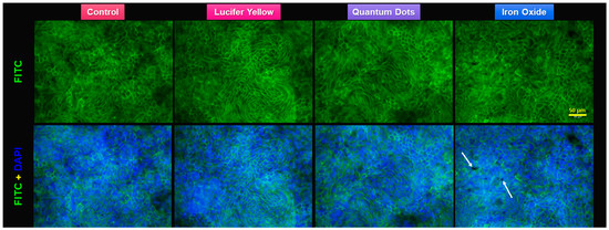 Fluorescence staining of the actin cytoskeleton of Caco-2/HT29-MTX monolayer after the 3-h transport study. F-actin is marked with fluorescein isothiocyanate (FITC)-phalloidin (green). Nuclear counterstain with 4′,6-diamidino-2-phenylindole (DAPI) (blue). Note the aggregates of α-Fe2O3 nanoparticles (white arrows) on the top of the cells.