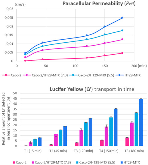 Effective permeability increases across all intestinal in vitro variants (top graph). Lucifer Yellow transport over time (bottom graph) shows the relative amount (in percentages) of the paracellular marker, which was detected at five measurement points during the experiment. Data are calculated as means ± standard deviation (SD) (n = 3).