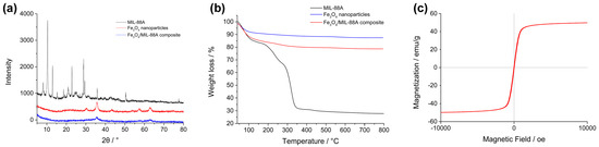 (a) The X-ray powder diffraction (XRD) patterns of MIL-88A (black), Fe3O4 nanoparticles (red) and magnetic Fe3O4/MIL-88A composite (blue); (b) thermogravimetric analysis (TGA) curves of MIL-88A (black), Fe3O4 nanoparticles (blue) and magnetic Fe3O4/MIL-88A composite (red); (c) The magnetization curve of magnetic Fe3O4/MIL-88A composite.