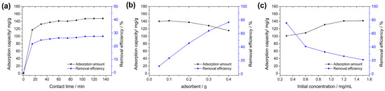 The effect of contact time (15–135 min) on the removal efficiency of BPB was shown in Figure 3a. At the initial stage of adsorption, an increasing adsorption could be observed. However, the increase of adsorption slowed down as the adsorption proceeded, and finally the adsorption reached saturation. The maximum adsorption amount (141.2 mg/g) was achieved at 60 min with removal efficiency of 26.2%. After 135 min of adsorption, no significant increase in adsorption amount was observed (141.2 mg/g to 147.9 mg/g). Similar patterns could be obtained in many adsorption experiments of dyes [33].