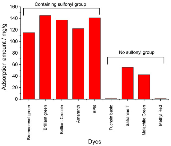 Eight dyes, Bromocresol Green, Brilliant Green, Brilliant Crocein, Amaranth, Fuchsin Basic, Safranine T, Malachite Green and Methyl Red, were investigated and compared at the same adsorption conditions (Figure 6). 0.1 g of Fe3O4/MIL-88A powders were transferred into 50 mL of 1.0 mg/mL of dye solutions, the mixture was shaken at 27 °C for 60 min. The adsorption amount was calculated through monitoring the change of absorbance for each dye solution. Among these dyes, Bromocresol Green, Brilliant Green, Brilliant Crocein, Amaranth, and BPB all contain sulfonyl groups. However, there is no sulfonyl group in the structure of the other four dyes, Fuchsin Basic, Safranine T, Malachite Green and Methyl Red. As a result, five dyes containing sulfonyl groups showed much better adsorption amounts than that of dyes without sulfonyl group. In particular, there was nearly no adsorption for Fuchsin Basic and Methyl Red. Some computed and experimental properties were listed in Table 3. Topological polar surface area (TPSA) values were obtained on the Pubchem website (https://pubchem.ncbi.nlm.nih.gov/compound/) and pKa values were obtained on the Chemicalbook website (https://www.chemicalbook.com/). The TPSA was defined as the sum of surfaces of polar atoms in a molecule. This property has been shown to correlate with the human intestinal absorption and blood–brain barrier penetration. Herein, BPB, Bromocresol Green, Brilliant Green, Brilliant Crocein and Amaranth with higher adsorption amounts showed relative higher TPSA values and lower pKa values. Based on these results, it might be assumed that magnetic Fe3O4/MIL-88A composite could effectively adsorbed dyes with sulfonyl groups, and the polar surface and pKa values of molecules might affect the adsorption. However, the detailed mechanism, especially in the surface charge of absorbent and dyes, still needs more in-depth and systematic studies in future [47].