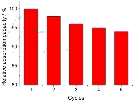 The reuse of adsorbent is an important aspect for practical application in economic aspect. To evaluate the reusability of magnetic Fe3O4/MIL-88A composite, the adsorbed composite was desorbed with ethanol solution and used for next adsorption cycles. The adsorption capacity of each cycle was monitored and the relative adsorption capacity was calculated by comparing with the first run in percentage form (adsorption capacity defined as 100%). Five cycles’ reuse of magnetic Fe3O4/MIL-88A composite was shown in Figure 7. It could be seen that Fe3O4/MIL-88A maintained high adsorption capacity (94%) without significant loss after five cycles. The result demonstrated that Fe3O4/MIL-88A composite could be applied in practical application owing to their high adsorption capacity and good reusability.