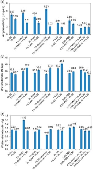 (a) Air permeability, (b) dry tensile index, and (c) wet tensile index of paper hand sheets produced from recycled fibers and different additive macromolecules.