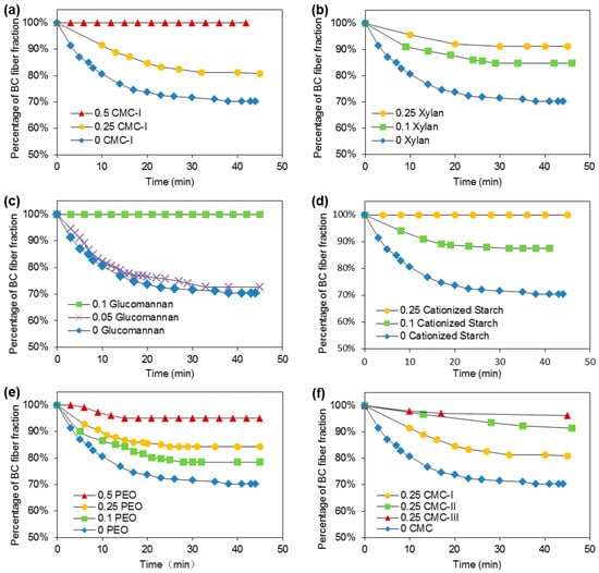 The changes of the percentage height of BC fiber fractions in the 250 mL-cylinder with time for BC fiber suspensions dispersed by (a) CMC-I, (b) xylan, (c) glucomannan, (d) cationized starch, (e) PEO, and (f) CMC.
