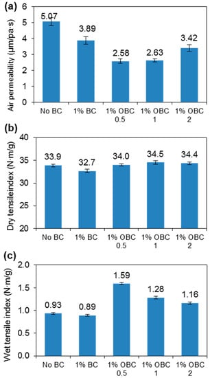 (a) Air permeability, (b) dry tensile index, and (c) wet tensile index of paper hand sheets produced from recycled fibers and oxidized BC fibers.