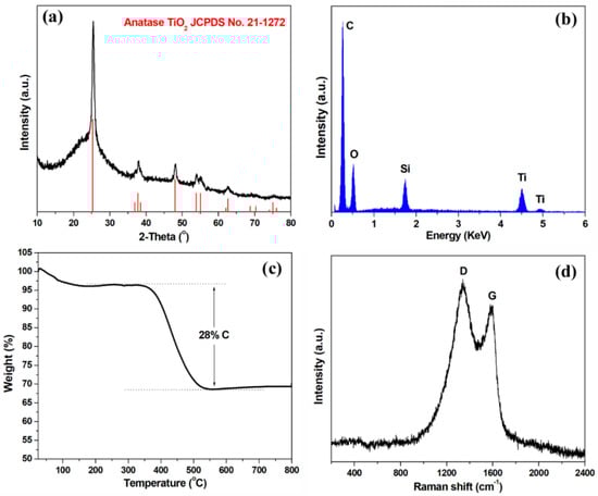 Figure 1a displays the XRD pattern of the TSC nanofibers, in which all the apparent peaks can be indexed to the anatase TiO2 (JCPDS No. 21-1272). No peaks corresponding silica can be observed, indicating its amorphous nature in the hybrid. The broad peak at ~25° can be related to the graphite carbon. Even though no XRD peaks for silica can be observed, the EDS spectrum clearly reveals the presence of Si element as well as the Ti, O and C elements (Figure 1b). The Ti/Si atomic ratio is approximately 1.30 (Figure S2), which is consistent with the theoretical value. In order to determine the relative contents of titania, silica and carbon, thermogravimetric analysis (TGA) was performed. As shown in Figure 1c, the carbon content in the TSC nanofibers is ~28 wt.%, thus the contents of titania and silica can be estimated to be 45.5 and 26.5 wt.%, respectively. Raman spectroscopy was employed to study the graphitic crystallization and the molecular vibrations in the TSC nanofibers. As shown in Figure 1d, two prominent peaks are observed at ~1348 and ~1596 cm−1, which correspond to the D-band and G-band of graphite [], respectively. The ID/IG intensity ratio for TSC is 1.1, indicating a high defect degree of the carbon nanofibers. Besides, no apparent peaks for TiO2 and SiO2 can be observed, which may be owing to their full incorporation into the carbon matrix.