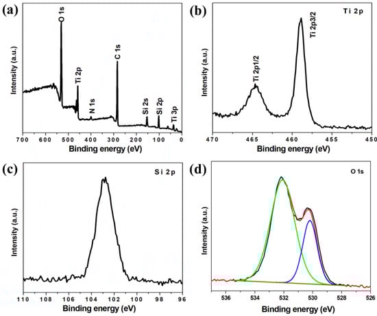 X-ray photoelectron spectroscopy (XPS) was performed to determine the chemical composition and the elemental states of the TSC nanofibers. Figure 3a shows the survey XPS spectrum, in which we can clearly see the presence of the Ti, Si, O, N and C elements. In the Ti 2p XPS spectrum (Figure 3b), the doublet peaks at 464.6 and 458.9 eV can be indexed to Ti 2p1/2 and Ti 2p3/2 with the highest oxidation state of Ti(IV) [], confirming the formation of TiO2 in the TSC nanofibers. As shown in the Si 2p XPS spectrum (Figure 3c), the broad peak centered at around 103.0 eV reveals the oxidation state of Si(IV) []. In Figure 3d, the O 1s XPS spectrum shows two well-defined peaks located at around 532.0 and 530.0 eV, which are corresponding to the Si-O and Ti-O, respectively [].