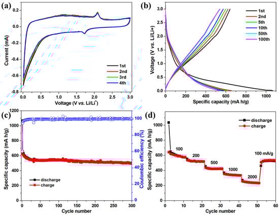 (a) CV curves at a scan rate of 0.1 mV/s; (b) galvanostatic discharge-charge profiles at 100 mA/g; (c) cycle performance at 100 mA/g; and (d) rate performance of TSC nanofibers at different current densities.