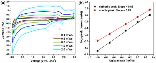 It is well known that the lithium storage mechanism of TiO2 is based on the insertion/extraction of Li ion in TiO2 crystal. However, nanosized particles can provide additional Li-storage capacity via surface reaction [,]. To further explore the charge storage mechanism of the TSC hybrid, CV tests were performed at different scan rates (Figure 5a). For a redox reaction, the peak current i and the scan rate v obeys the power-law equation [,,,], where a and b are fitting parameters. The slope of the fitting line is the b value in the log()-log() plot, which reflects different charge storage mechanism. Generally, b = 1 indicates a capacitive behavior, while b = 0.5 implies a diffusion-limited process. As shown in Figure 5b, the b values for the fitting lines arising from the cathodic peaks in 1.5–2.0 V and the anodic peaks in 2.0–2.5 V are 0.85 and 0.73, respectively. Both b values in the range of 0.5–1.0 indicate that the electrochemical mechanism is both diffusion-limited and capacitive. The fast Faradaic pseudocapacitive process happens in the surface layers of nanosized particles, which not only contributes to additional Li-storage capacity, but also a high rate capability.