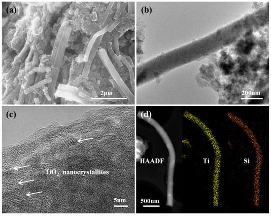 (a) SEM, (b) TEM, (c) HRTEM images of the TSC nanofiber electrode after 300 cycles at 100 mA/g. (d) HAADF-SEM image with corresponding EDS maps of Ti and Si elements in a single TSC nanofiber after cycling.