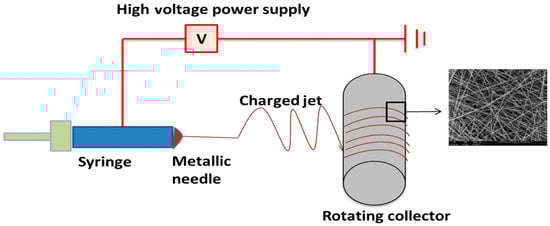 Schematic representation of electrospinning apparatus with a rotating collector. Reproduced with permission from [Coatings]. Copyright MDPI, 2014.