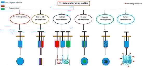 Electrospinning has different drug loading types, which determine the diverse structure and drug release kinetics. The drug loading procedure in electrospinning can be executed in different ways, including co-electrospinning, multi electrospinning, side-by-side electrospinning, co-axial, surface immobilization and emulsion electrospinning (Figure 2). In co-electrospinning, the drug molecules are mixed with the polymer solution before electrospinning. These electrospun fibers provide a uniform distribution of drugs/biomolecules and high drug/biomolecule loading. However, the biomolecule properties can be negatively affected when they are directly exposed to high voltage. On the other hand, blend electrospinning and side-by-side electrospinning help to solve the issue of drug and molecule solubility in common solvents. Moreover, multi-jets with more than two spinnerets represent a way of protecting the bioactivity of the drug. In addition, surface immobilization is another method, in which drug molecules are covalently bonded with the scaffolds via chemical or physical immobilization methods. In these chemical methods, the surfaces of the nanofibers are changed by introducing amines, carboxyl, hydroxyl or thiol; the physical methods involve the incorporation of Van der Waals, electrostatic and hydrophobic interactions. These methods of immobilization retain biomolecular activity, but the drug molecules in all electrospinning processes exhibit burst release kinetics. To overcome this, co-axial and emulsion electrospinning processes were introduced. Co-axial and emulsion electrospinning processes have been gaining increasing interest recently due to their promising ability to shield the biomolecules with the core and to minimize the drawback of the initial burst. They provide sustained release of the drug by minimizing the initial burst release by controlling the thickness and composition of the shells. The core/shell structure is generated utilizing a single-nozzle electrospinning unit employing emulsion input, commonly named emulsion electrospinning []. Another means of drug loading for sustained release of a drug is layer by layer, via the addition of drug in between the electrospun scaffolds; controlled release is promoted by the shield provided by the layer of polymer scaffolds. Therefore, co-axial electrospinning and multilayer electrospinning drug loading types provide a more sustained and controlled release of the drug.